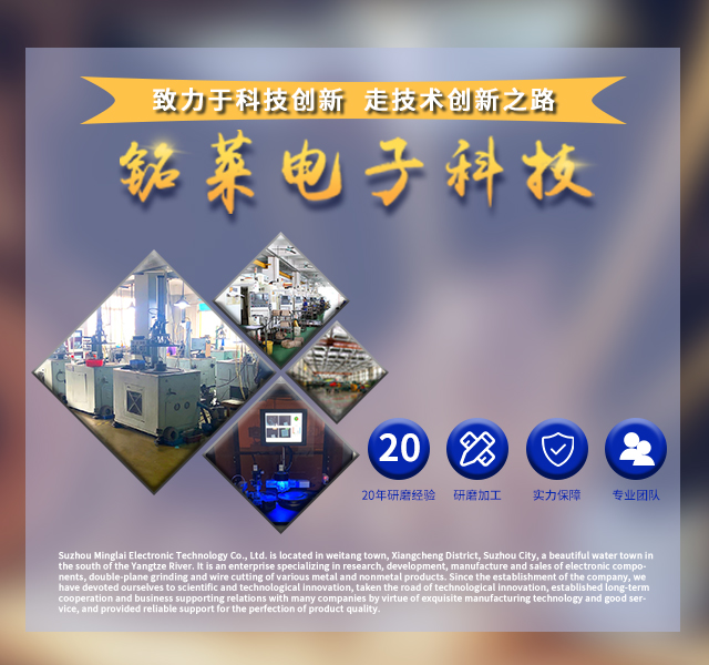 苏州市铭莱电子科技有限公司坐落于美丽的江南水乡苏州市相城区渭塘镇,是一家专业研发、制造和销售电子元器件产品、双平面研磨及线切割加工各种金属和非金属产品的企业。自公司成立以来,致 ...